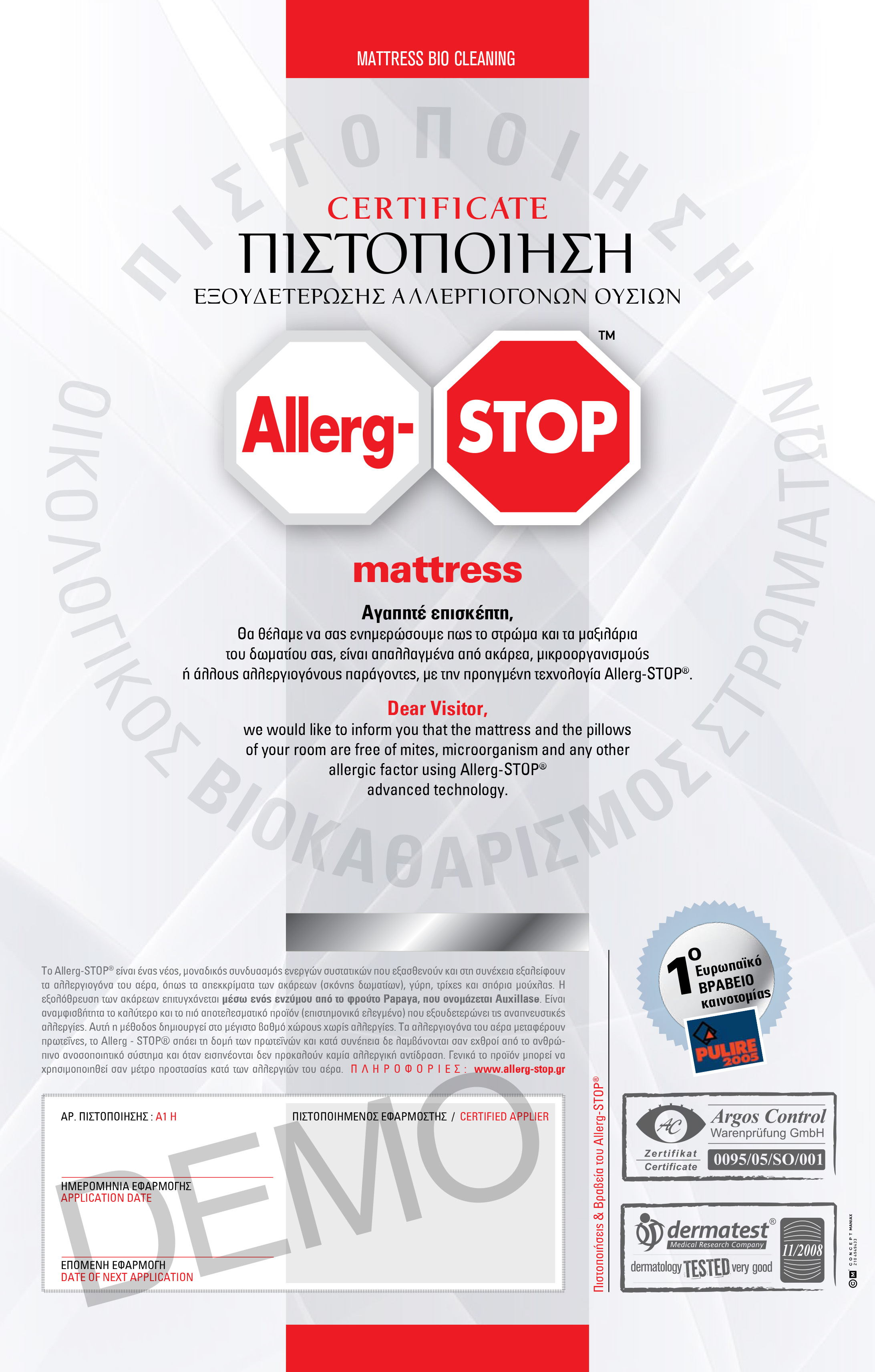 Παρέχουμε γραπτή πιστοποίηση εξουδετέρωσης αλλεργιογόνων ουσιών Αllerg – STOP, σε κάθε στρώμα, χαλί, μοκέτα, σαλόνι ή σαλόνι αυτοκινήτου στο οποίο εφαρμόζεται η τεχνολογία Αllerg – STOP.